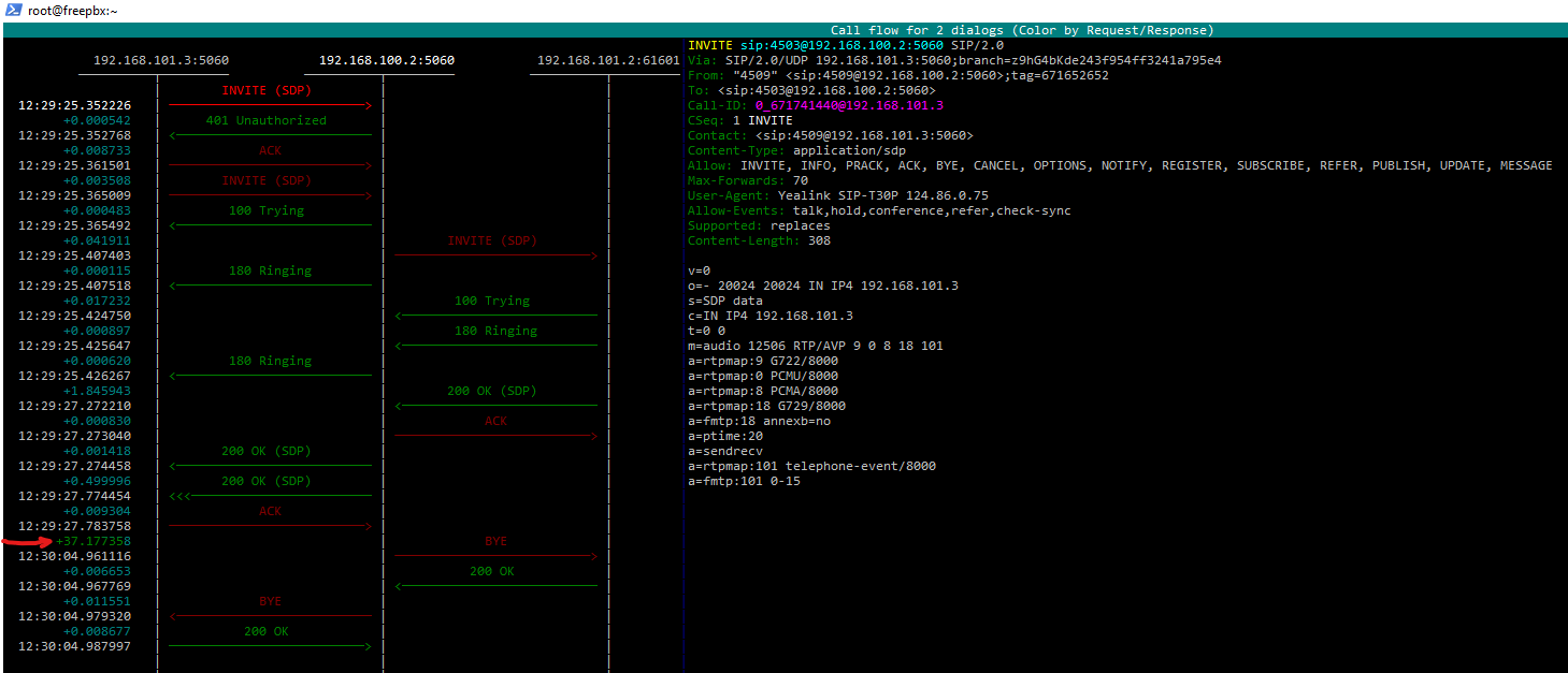 При завершении разговора одной из сторон на второй стороне вызов не прекращается еще 30 секунд, по завершении которых в логе появляется строка: