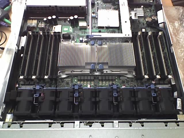 Таких вообще-то два. Завтра сфотаю. В общих чертах - это одноюнитовый полной глубины сервер, не шумит совсем. Вентиляторы реагируют на любую микро-дополнительную нагрузку чуть слышным прибавлением оборотов. Держит рабочую температуру 24 С~