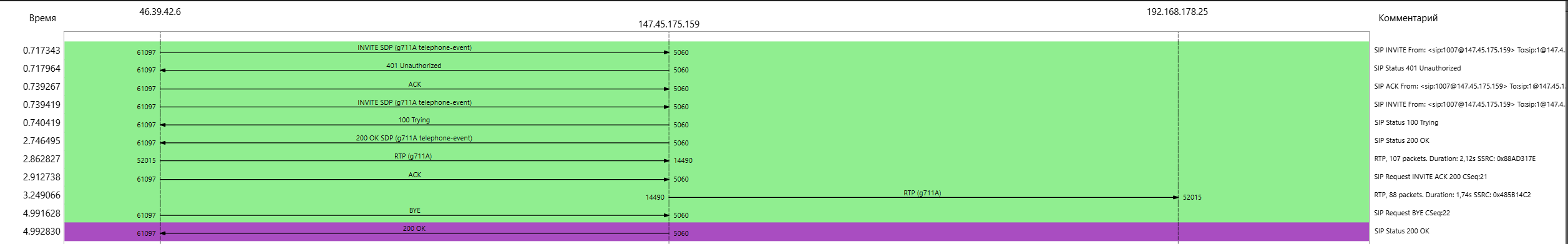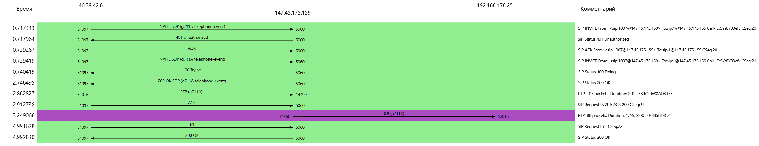 Важная зацепка: выделенный фиолетовым цветом RTP поток - содержит звук! Это важно, потому, что спектр поиска теперь смещается от самого asterisk к правильному построению диалога между участниками.
