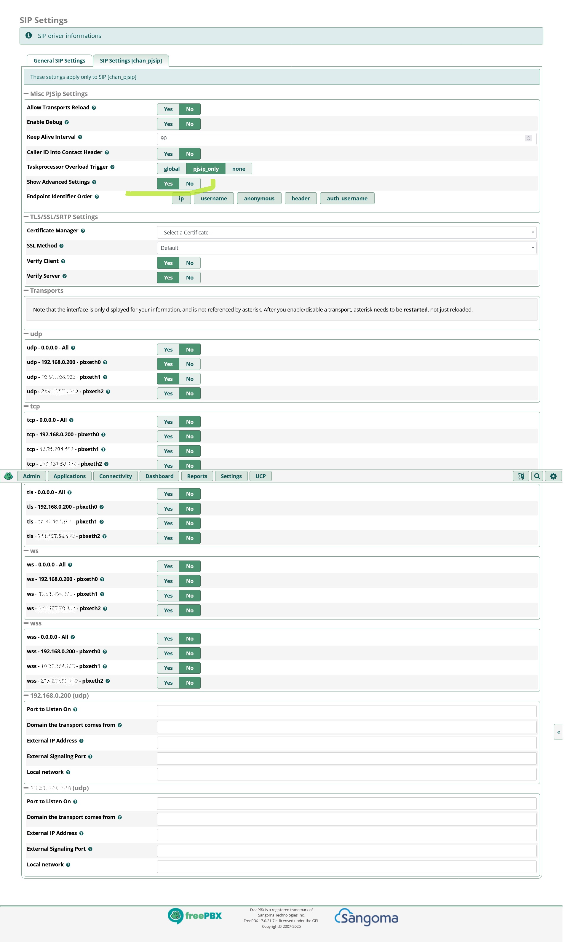 На вкладке SIP Settings [chan_pjsip] есть заветный параметр Show Advanced Settings - он в положении NO.
