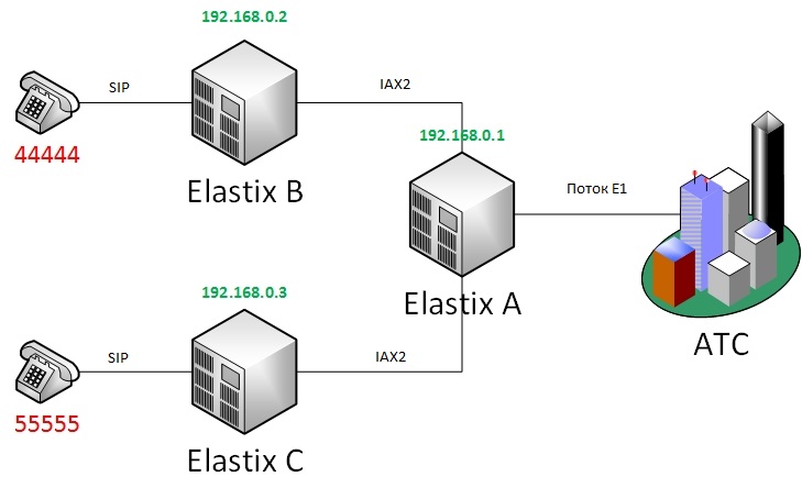 Вызовы на городские линии с телефонов, подключенные к серверам В и С не работают. А телефоны подключенные к боевому Asterisk'у (Server A) звонят нормально...