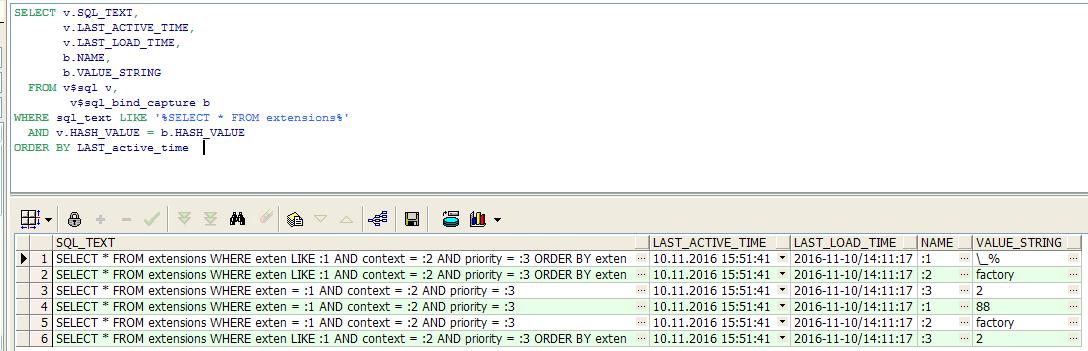 А вот что выдает v$sql в Oracle при попытке позвонить на номер 88. Меня смущает значение переменной \_% . Может что то нужно тут придумать? Буду благодарен за помощь.