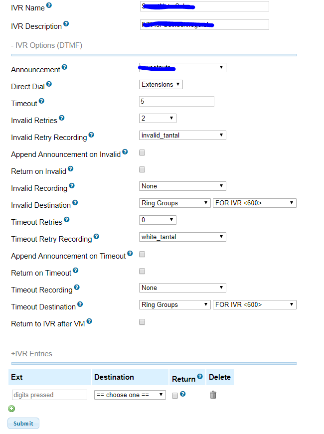 Во вложении скриншот, как у нас настроен IVR. Абонент звонит на номер компании, слушает автоответчик, в любой момент времени нажимает добавочный номер "Extension" и переводится на сотрудника. Если абонент, ничего не нажимает, то он автоматически после того, как прослушает приветствие, попадает на группу дозвона с номером 600 (куда включены 2 секретаря).