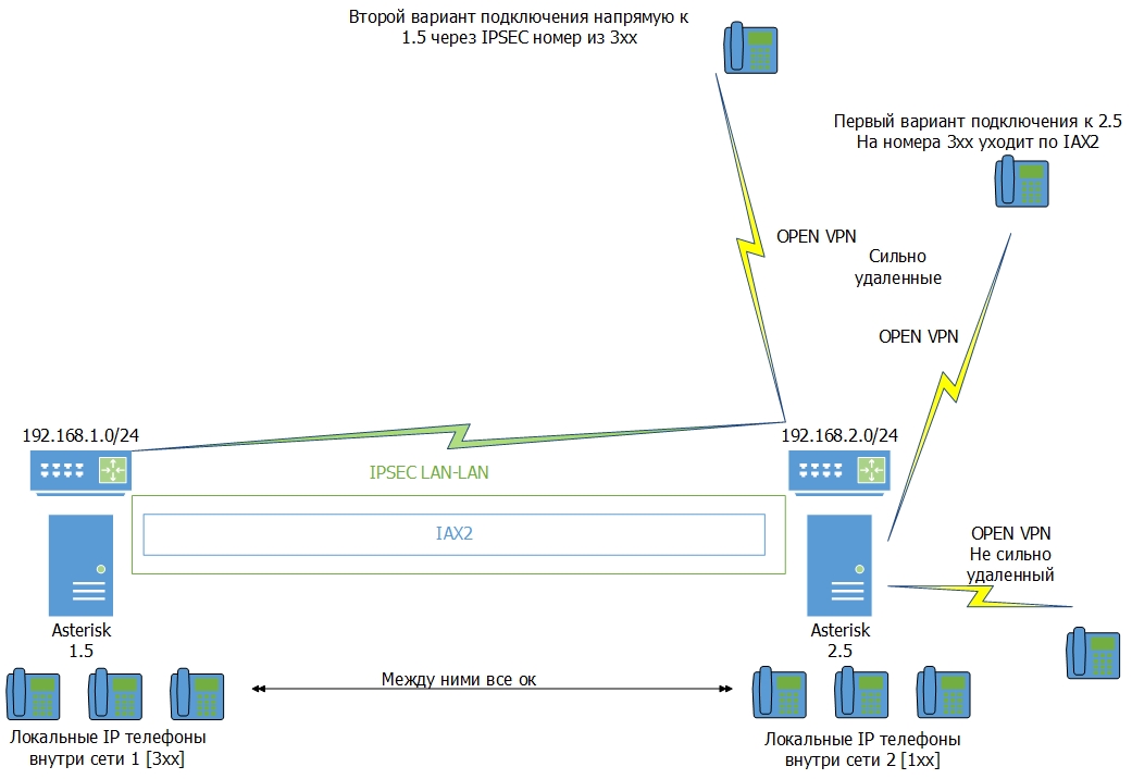 Сломал уже всю голову, что с этим делать. Когда уже все сделано и настроено выяснилась проблема с которой пока не понятно, как бороться. Придумываются пока костыли, как раз на схемке показал (подключение доп линий на этих телефонах в обход IAX на прямую к другим АТС и звонков уже по тем номерам и соответсвенно на них, с тех АТС по ихним внутренним номерам тех АТС), но это как постоянный вариант судя по всему не пойдет. А выяснилось не сразу, потому что удаленные абоненты не сразу и не так активно стали использовать такой сценарий.