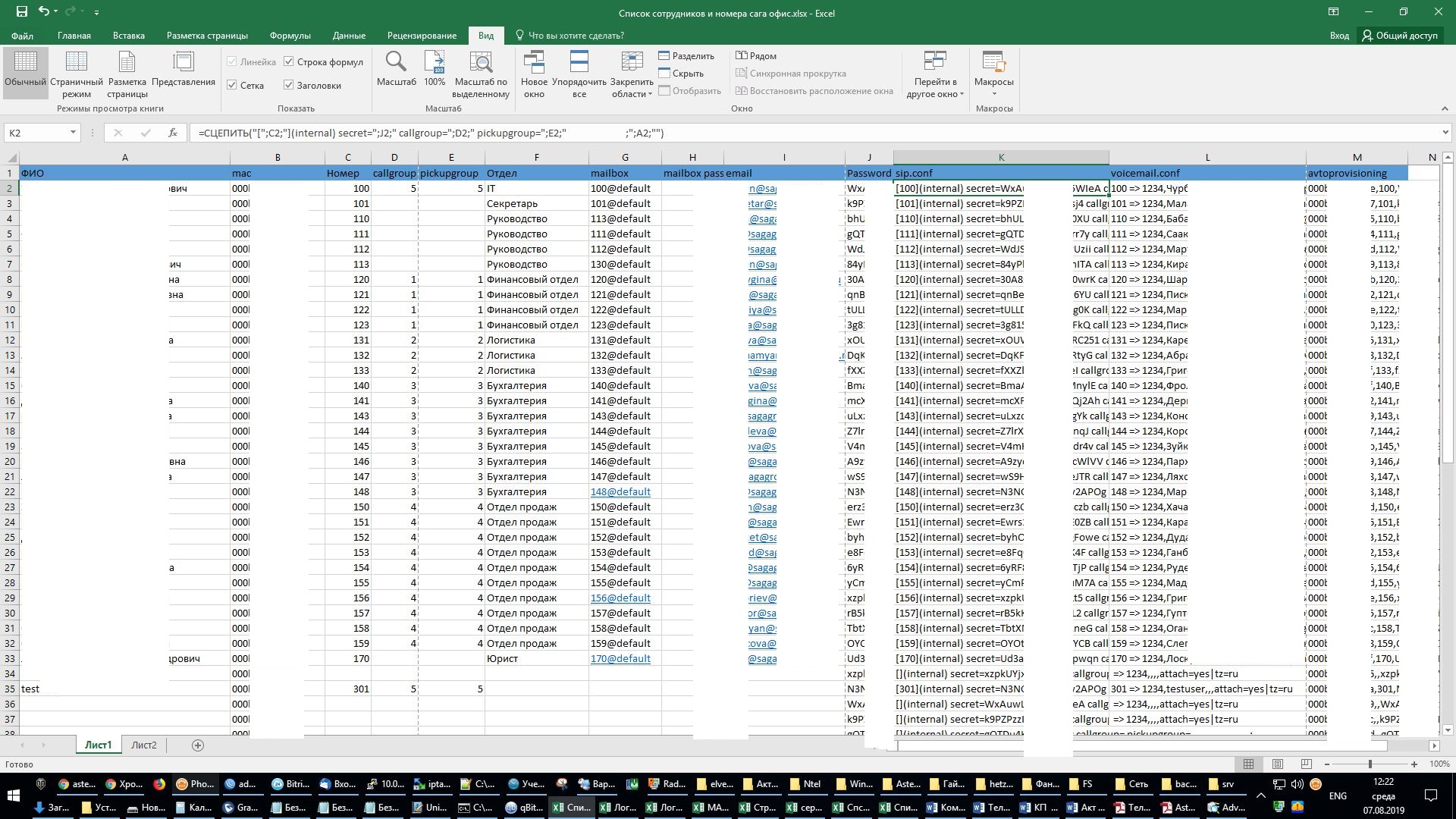 Файл список.xls, в котором забита вся информация и с помощью формул (=сцепить) и кучи полей автоматически формирую строки которые нужны для настройки (sip.conf, voicemail.conf, autoprovisioning и прочее, что может понадобиться). Смысл в том, что бы автоматизировать заполнение конфигов до простого копипаста. Содержимое список.xls: