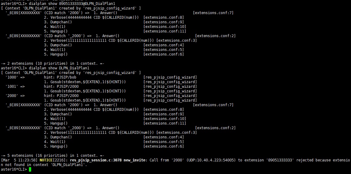[Mar 5 11:23:58] NOTICE[2216]: res_pjsip_session.c:3078 new_invite: Call from '2000' (UDP:10.40.4.223:54005) to extension '89051333333' rejected because extension not found in context 'DLPN_DialPlan1'.