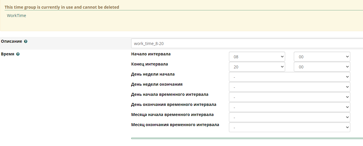 В приложения - правила по времени выбранная временная группа созданная выше настроена так, что при текущем совпадении времени должно вызываться IVR меню, а при не совпадении проигрываться сообщение "вы позвонили в нерабочие часы"