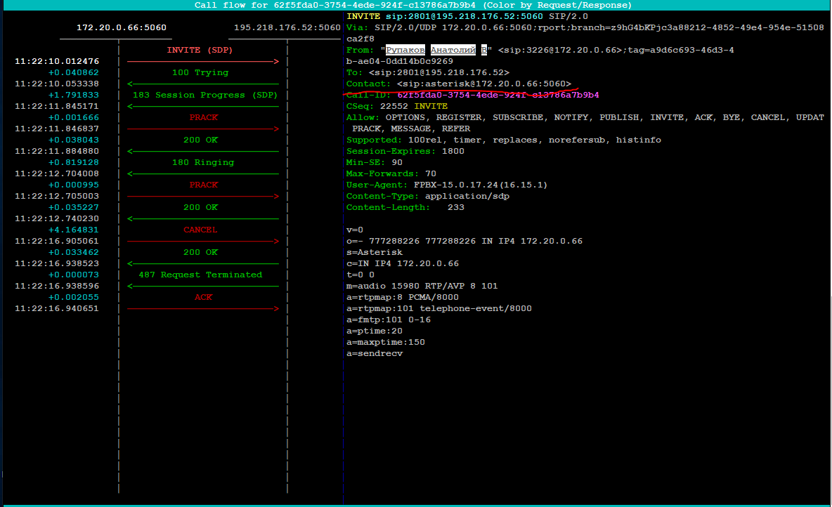Дальше был перенос конфы боевого 13го FreePBX на 15й. Получилось даже неплохо, почти всё заработало, но вместе с конфой перенеслась и проблема, я снова получаю неправильный Contact.