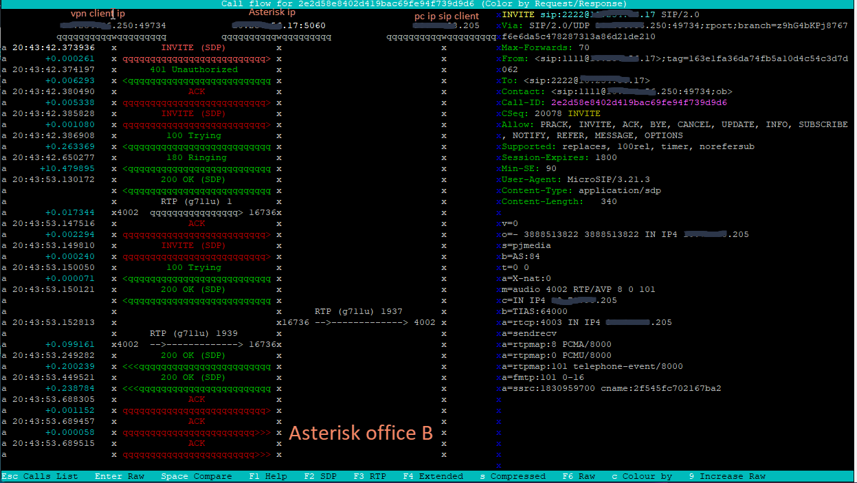 На каждом из концов офисов (шлюзах) создан vpn-клиент, и на каждом Asterisk зарегистрирован sip номер. Проблема в том что при звонке одного sip номера что зарегистрирован за vpn-клиентом, на другой номер второго Asterisk, слышно собеседника только из одной стороны (схема прилагается, а также sngrep из каждого сервера ). rtp 10000-20000 разрешены.