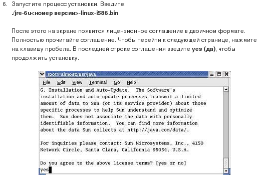 После этого на экране появится лицензионное соглашение в двоичном формате. Полностью прочитайте соглашение. Чтобы перейти к следующей странице, нажмите на клавишу пробела. В последней строке соглашения введите yes (да), чтобы продолжить установку.