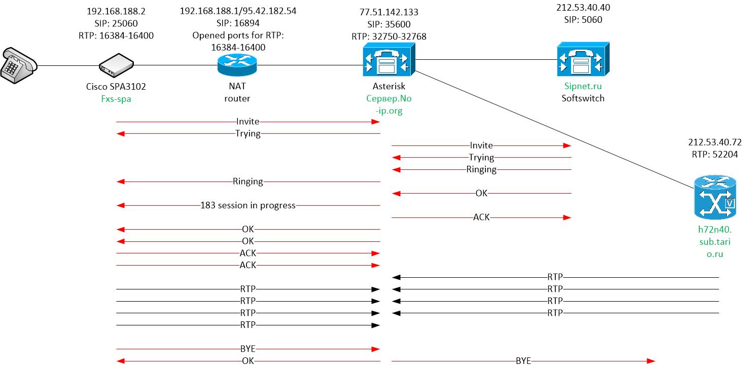 Не работает прохождение голосового трафика при звонке с клиента на провайдера. При этом сигнализация проходит и открываются RTP поток от SIPNET до Asterisk и RTP поток от клиента до Asterisk, но Asterisk почему то эти потоки хоронит в себе, а не заворачивает на клиента и провайдера соответственно.