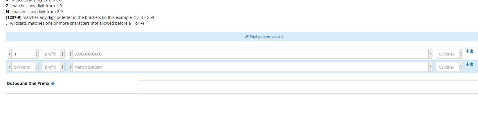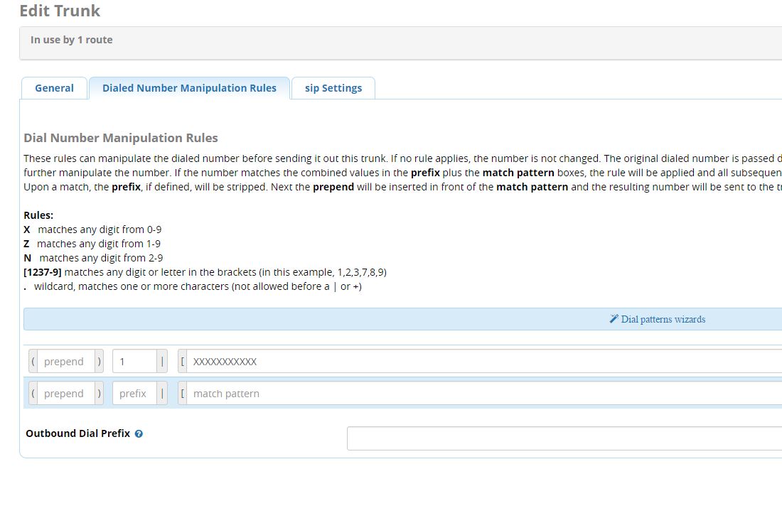 prepend 1, prefix пусто, match pattern XXXXXXXXXXX В исходящем маршруте тоже прописал диалплан аналогично транку.